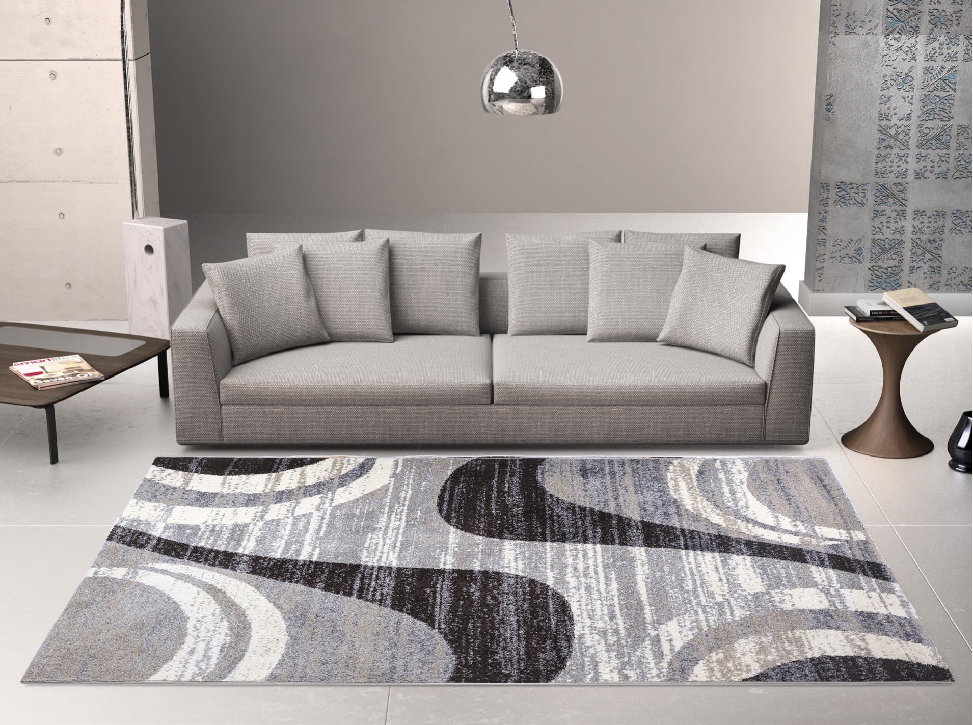 Tappeto decora in tessitura frisee e morbido al tatto. Disegno moderno. Evita l'effetto orma. Adatto a tutti i tipi di pavimento.